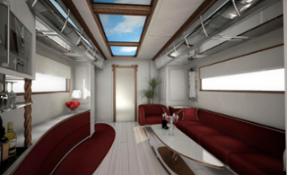 Marchi Mobile touts the EleMMent Palazzo as “The most luxurious RV in the world – offering unbeatable technically innovative and comfort features.” And, they’re not kidding. The design which takes aspects from the worlds of motor-sports, aviation and yachting includes features like a cockpit complete with an aviation dashboard and panoramic glazing where shade zones are controlled by a quick button push. Other awesomely futuristic elements to the EleMMent are an exterior, integrated stairwell with a main entry to the living room, electric sliding doors, an automatic sun canopy with lighting and audio and, if that’s not enough, an automatic retractable roof walkway!
