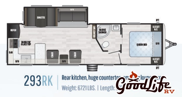 The 2019 Keystone Springdale 293RK is a 33-foot travel trailer with a rear kitchen layout and a single slide for added space. It weighs around 6,700 lbs dry and sleeps up to four people comfortably. Inside, you’ll find a spacious kitchen with plenty of counter space, a cozy living area, and a front queen bedroom. With a 52-gallon fresh water tank, 69-gallon gray tank, and modern amenities like a 13,500 BTU A/C and 30,000 BTU furnace, it’s built for comfort and convenience on the road.