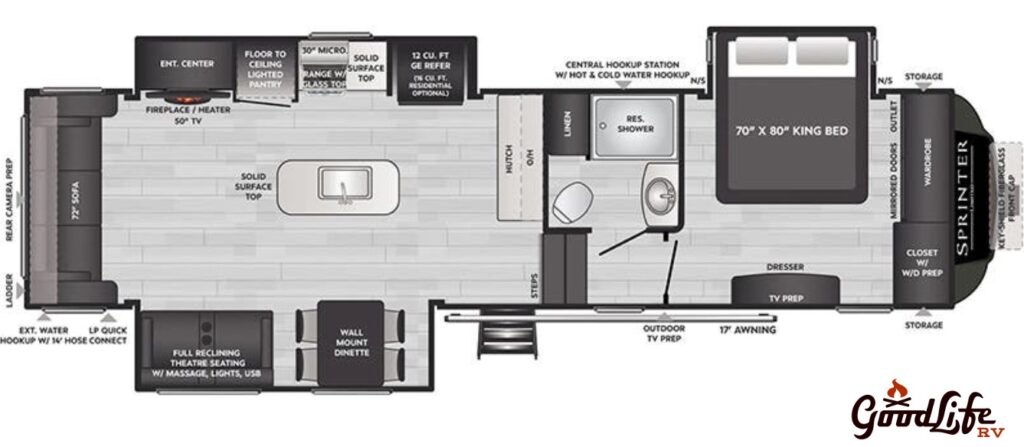 The 2022 Keystone Sprinter Limited 3190RLS is a rear-living fifth-wheel designed for comfort and convenience. It features a spacious living area at the back with theater seating, a large entertainment center, and plenty of natural light from rear windows. The mid-kitchen boasts an island, full-size appliances, and ample storage, while the front master bedroom includes a king-size bed, wardrobe, and washer/dryer prep. With three slide-outs, generous water tanks, and a well-thought-out layout, this Sprinter model offers a perfect blend of luxury and functionality for extended trips or full-time RV living. We NEED trades and do offer competitive financing options! For sale at Good Life RV in Webster City, Iowa. 515-832-5715
