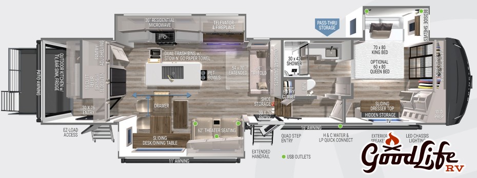 Disclaimer: We make every effort for complete and accurate descriptions of our RVs, but manufacturers and certain campers have changes or options that may not be noted and may differ. GLRV is not to be held responsible for misprints. Please verify the equipment on your RV before purchasing.
