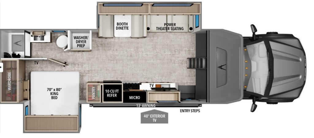 - Layout: Center Living, Center Kitchen, Front Cab, Rear Bath, Rear Bedroom