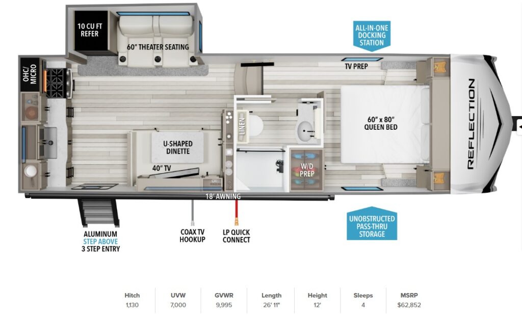 The Reflection 100 Series of half-ton towable fifth-wheel RV’s is an ideal solution for those seeking a feature-packed RV at a reasonable price. Its lightweight construction and low profile design means it can be safely towed by today’s half-ton trucks without sacrificing comfort or luxury. The Reflection 100 Series is the perfect choice for any budget or lifestyle. It’s everything you need to make your RV dreams come true. This and other great half-ton towable Reflection 5th wheels are For sale at Good Life RV in Des Moines, Iowa. 515-462-9800
